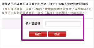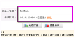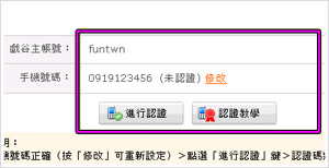 3.收到戲谷發出的「手機認證碼簡訊」後,請您將認證碼輸入畫面中的欄位後,按下「確認」以進行手機認證。