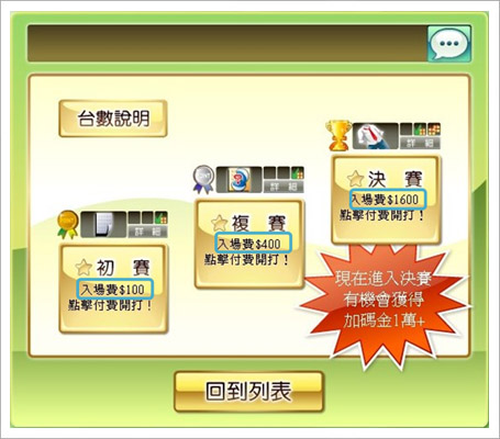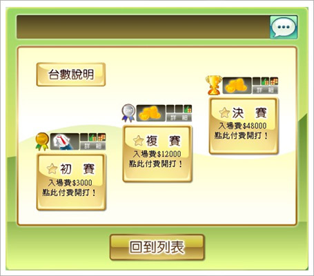 - 初賽:付門票或金幣後進入初賽,由四人配桌開賽,打1手,初賽結束為第一名者則獲得複賽的門票。若遇到玩家平手不分勝負則加賽20手,如果在加賽後仍無法分出勝負,則將門票或金幣退回。